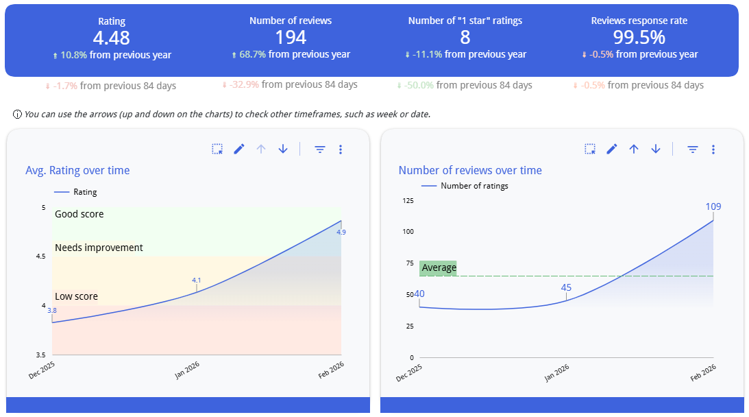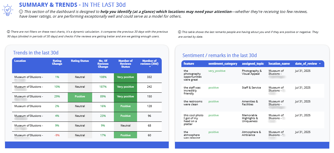The dashboard automatically compares the most recent 30-day window against the prior 30-day period to surface changes in both rating and review volume. Each location receives a dynamically calculated status, flagging whether review trends are very positive, neutral, negative, or very negative, so that locations needing attention are immediately visible without manual analysis.