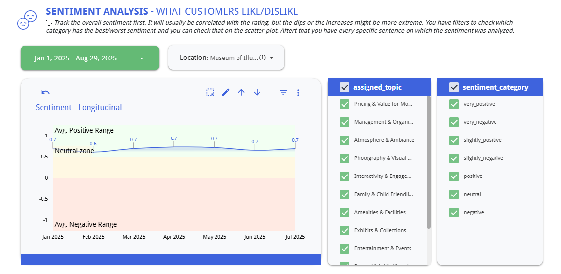 - Operational Insight from Unstructured Data LLM-powered analysis converts thousands of reviews into structured topic-level sentiment data, revealing patterns invisible to manual review reading.