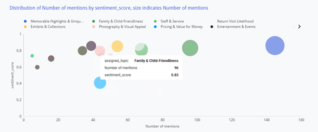 A scatter plot visualizes each topic category by sentiment score and mention volume, with bubble size indicating frequency. This allows leadership to instantly identify which topics generate the most discussion and whether that discussion is positive or negative — revealing, for example, that “Family & Child-Friendliness” drives high volume with neutral sentiment (an improvement opportunity), while “Memorable Highlights” generates high volume with strongly positive sentiment (a brand strength to amplify).