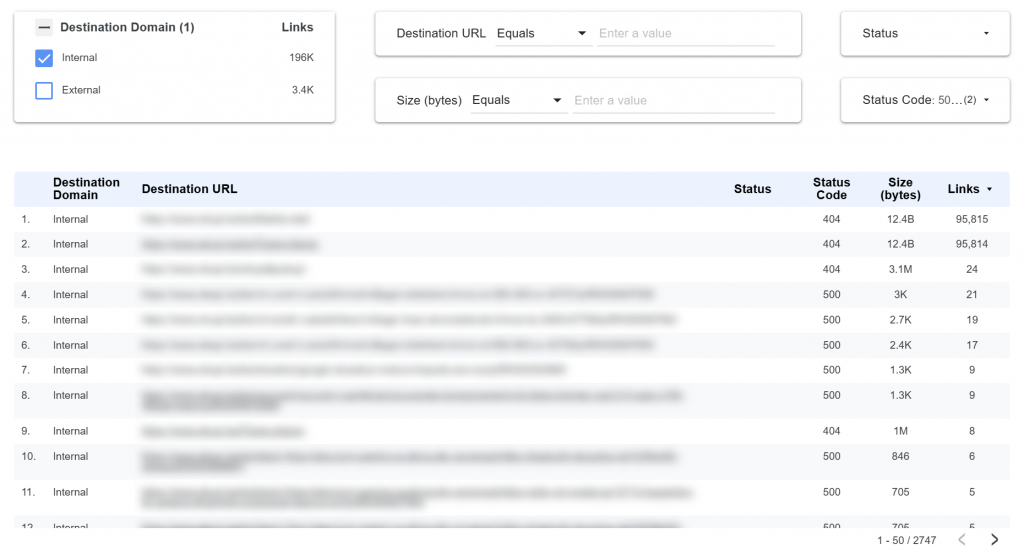 Finally, we built a quick but comprehensive Data Studio dashboard to not just visualize the data, but as a functional tool for the client’s web team to work with. They could easily select all inlinks with specific issues, like 5xx and 4xx errors, redirects, empty category pages, or discontinued products.