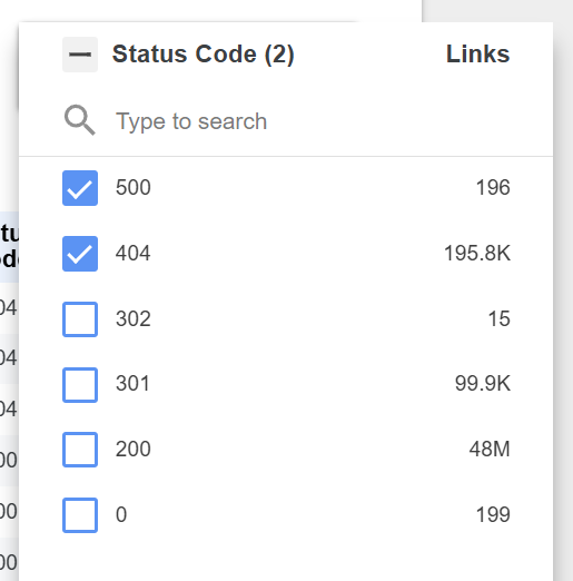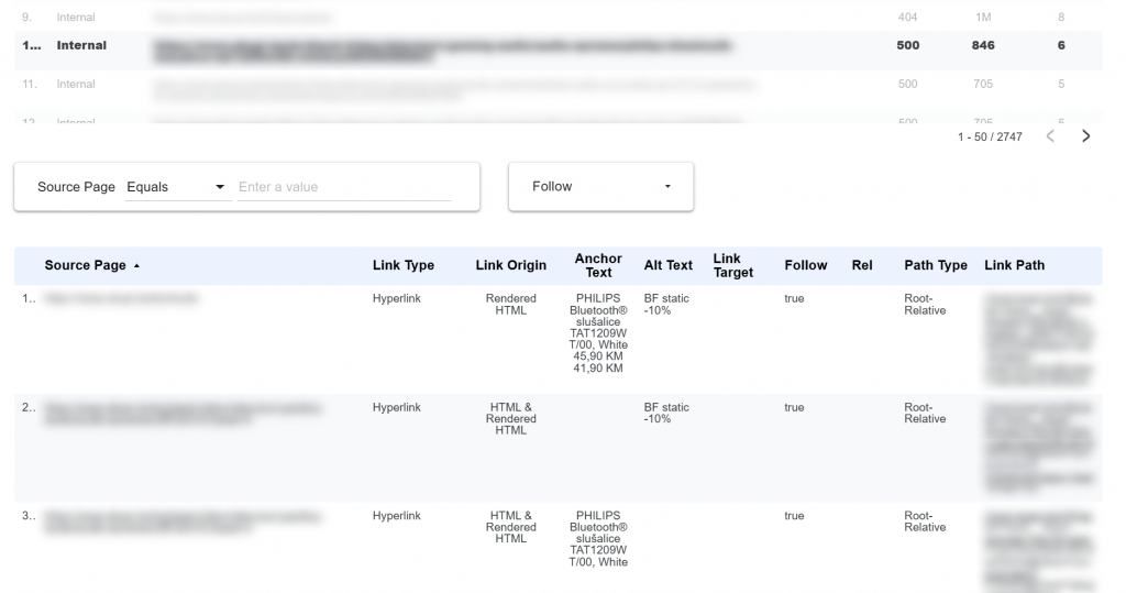First, use the filters to focus on a specific linking error → the first table lists all the link destination URLs that match selected filters.